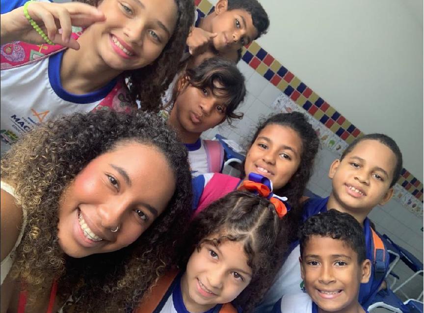 Júllia Kessia (in forefront), an enumerator for the state of Alagoas, poses for a photo with a group of young students she surveyed for Equidade.info.